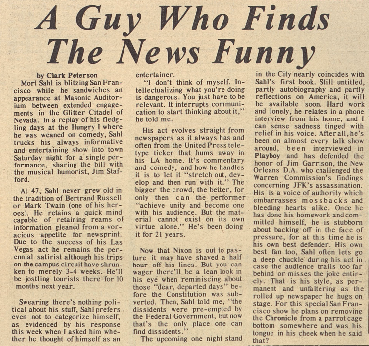 A baker's dozen of comedy articles written for the San Francisco Chronicle and Examiner in the early 80s. "Interviewed lots of comics both local and national. Some of my articles (included) were about Mort Sahl (1977), Michael Pritchard, Bob Sarlatte, Carrie Snow, Billy Lucas, Jeremy Kramer, Jack Marion, John Cantu, Jim Morris, Rick & Ruby, Jim Cranna, Dana Carvey, and women doing stand-up."