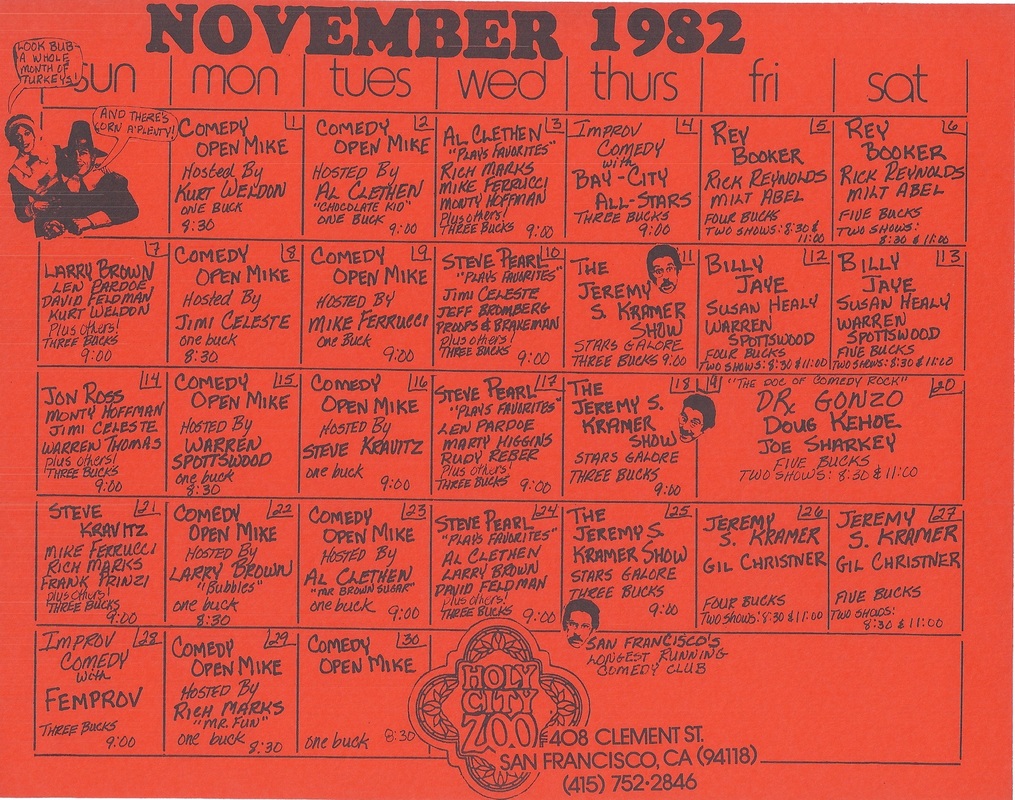Reverse: OCTOBER 1982 • NEWSLETTER Welcome to October. Okay, I know October has thirty one days, but who's counting? Since the thirty first is Halloween I figured it'd be kind of spooky if it were missing. No? Well, maybe I'll include an extra day in November. I hope you've all been enjoying the beautiful fall weather we've been having here in the bay area as much as I have. I've taken the opportunity to spend some time out at Candlestick Park to watch those red-hot Giants. I've even got tickets for the final two games of the season (we're not out of it yet). I've also gone out to the S.F. Zoo to see Prince Charles (the white tiger). It's a full life. As fine a month as September was, October promises to be even better, and I'm not basing this on some mere astrological forecast. As you can see from the Calender, I've compiled more bookings this month than last. If you are a San Franciscan, you may have noticed however, that I basically only have two engagements here in the city. The first one, on the first and second at Cobb's Pub, I'm very excited about. I'll be middle act with Bob Sarlatte. Many of my colleagues have been asking me, "Who died and made you middle act?" That notwithstanding, I'm looking forward to working with Bob, a performer I've always admired very much. The other S.. gig, on the twenty second and twenty third, is at Hart's, a restaraunt that has only just recently begun doing comedy. I always enjoy working at new clubs, and I'll be with Evan Davis, another very funny guy. The joke making business has been going very well for me. The more time I put in the better I get, and the better I get, well, the better I get. Once again, I appreciate all the support I've gotten from everyone. Thanks. FOR MORE INFO CALL 647-6469