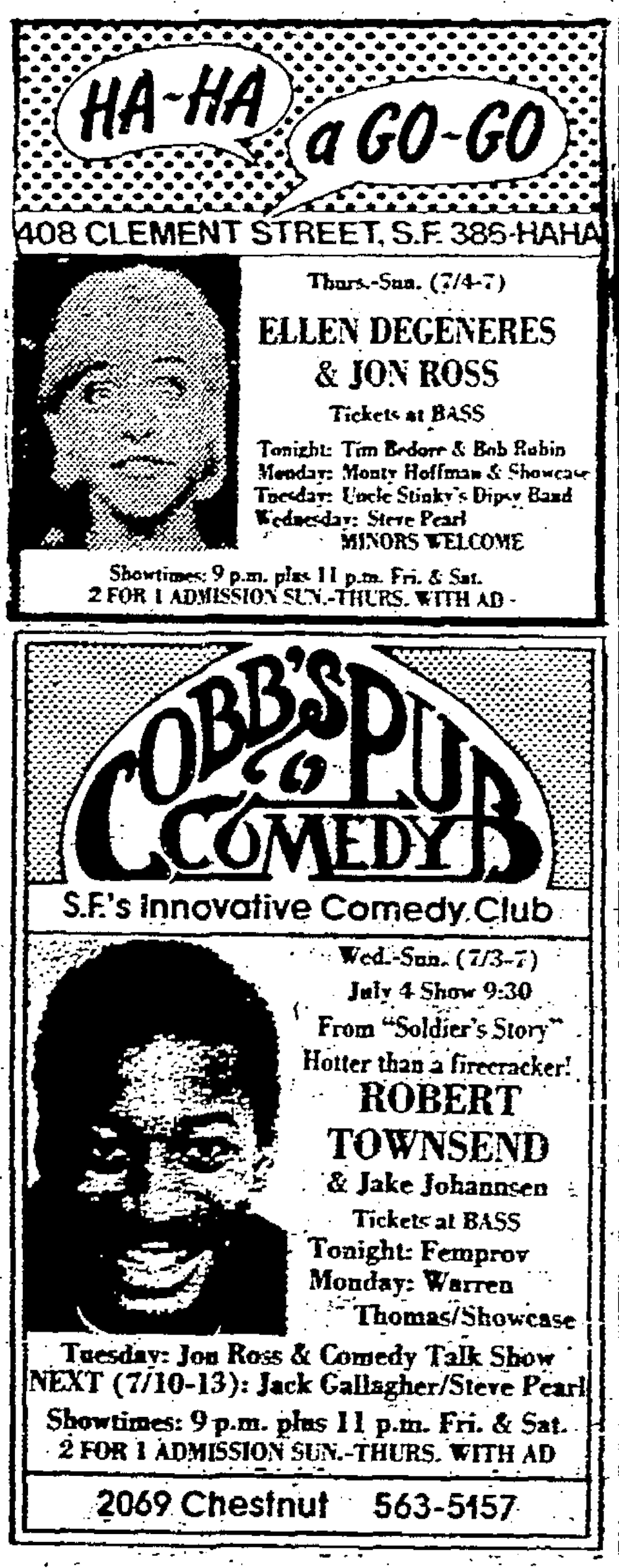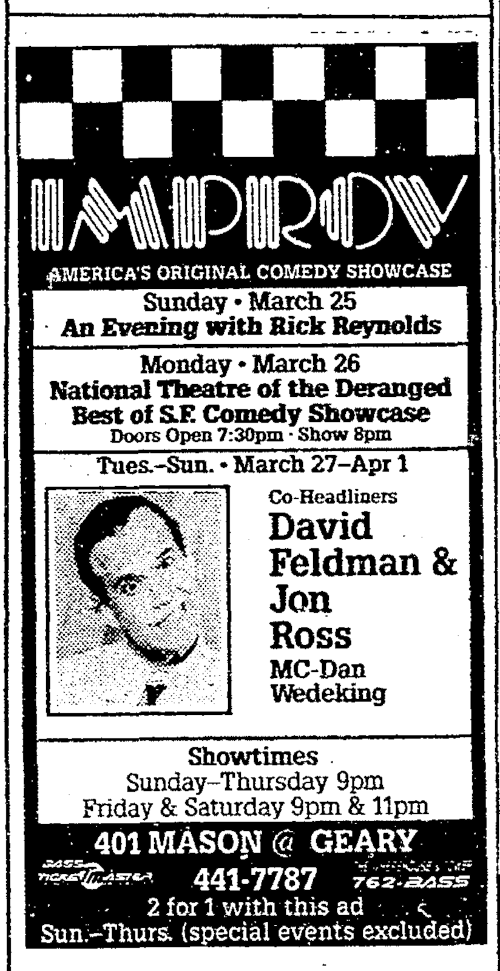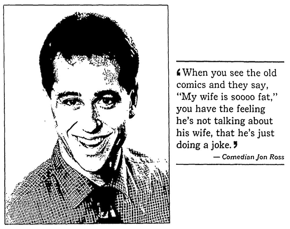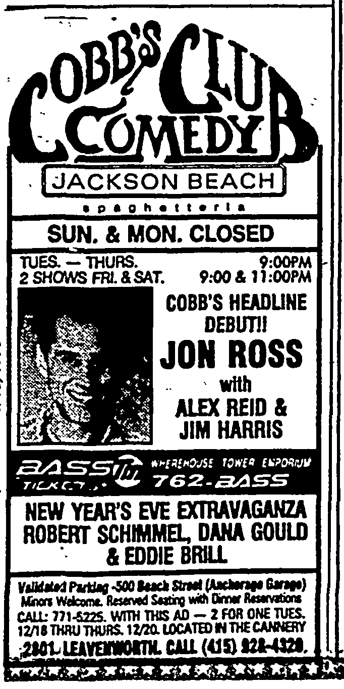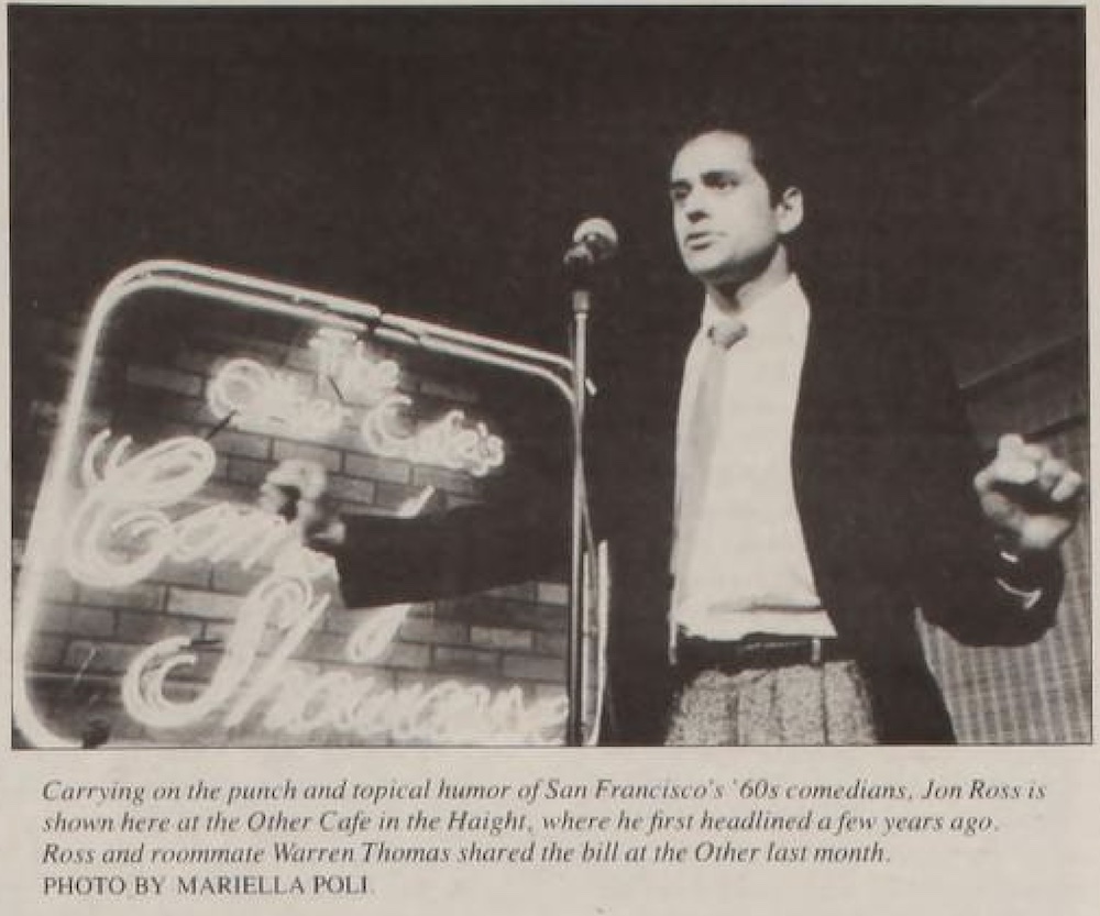 Jon Ross: "Warren Spottswood and I were playing a San Jose State rathskeller that never had comedy, a huge pizza-and-beer place. We had to bring our, own sound system which were these little lunchbox speakers that sounded like kazoos, for a room that held 500 people!"