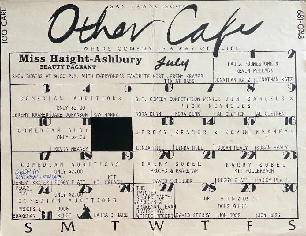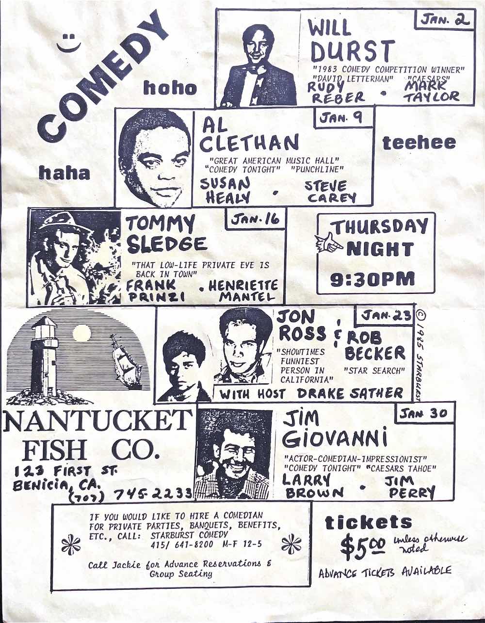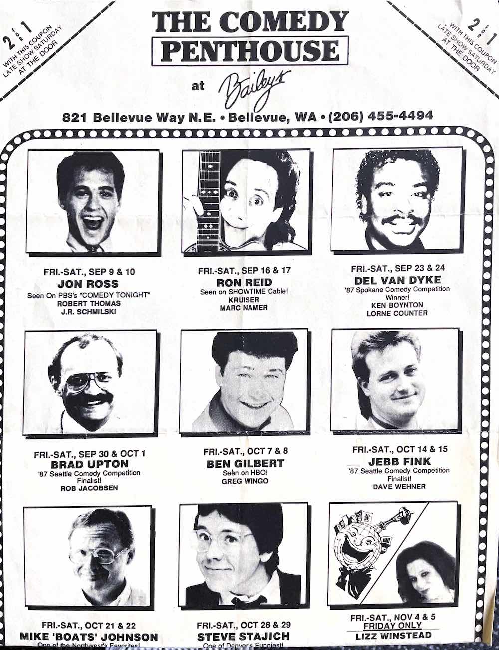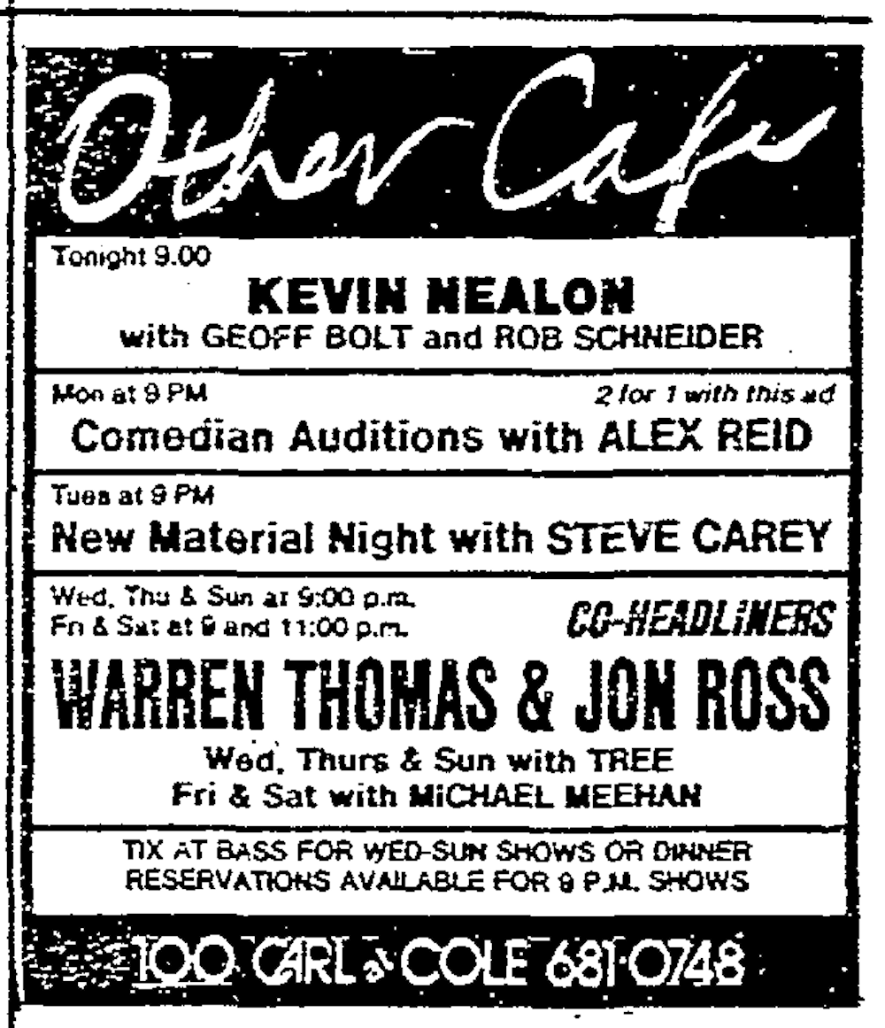 Jon Ross: "Warren Spottswood and I were playing a San Jose State rathskeller that never had comedy, a huge pizza-and-beer place. We had to bring our, own sound system which were these little lunchbox speakers that sounded like kazoos, for a room that held 500 people!"