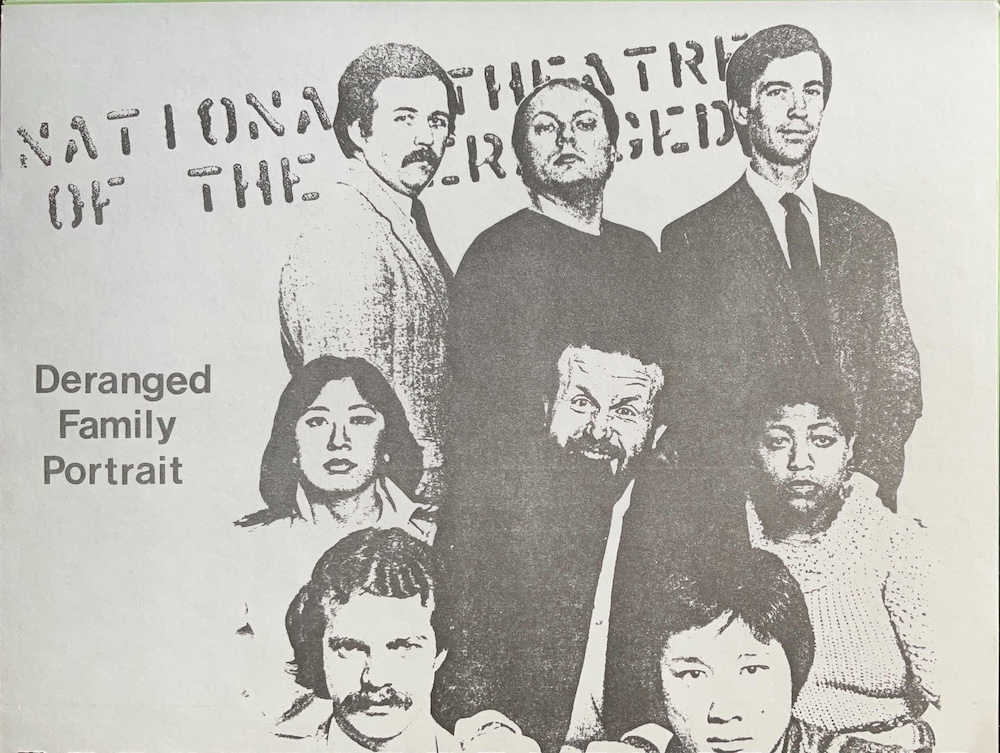 The National Theatre of the Deranged is a ten-member improvisational comedy troupe currently performing to sold-out houses in San Francisco. Working solely with audience suggestions from the day's news, the Deranged present a satirical "newscast" where no newsmaker or news gatherer is spared a parody. The Deranged is the only troupe of its kind: providing a strictly improvised, totally unrehearsed show. The audience never sees the same scene twice, and itself serves as a most integral part of the group's performance.
